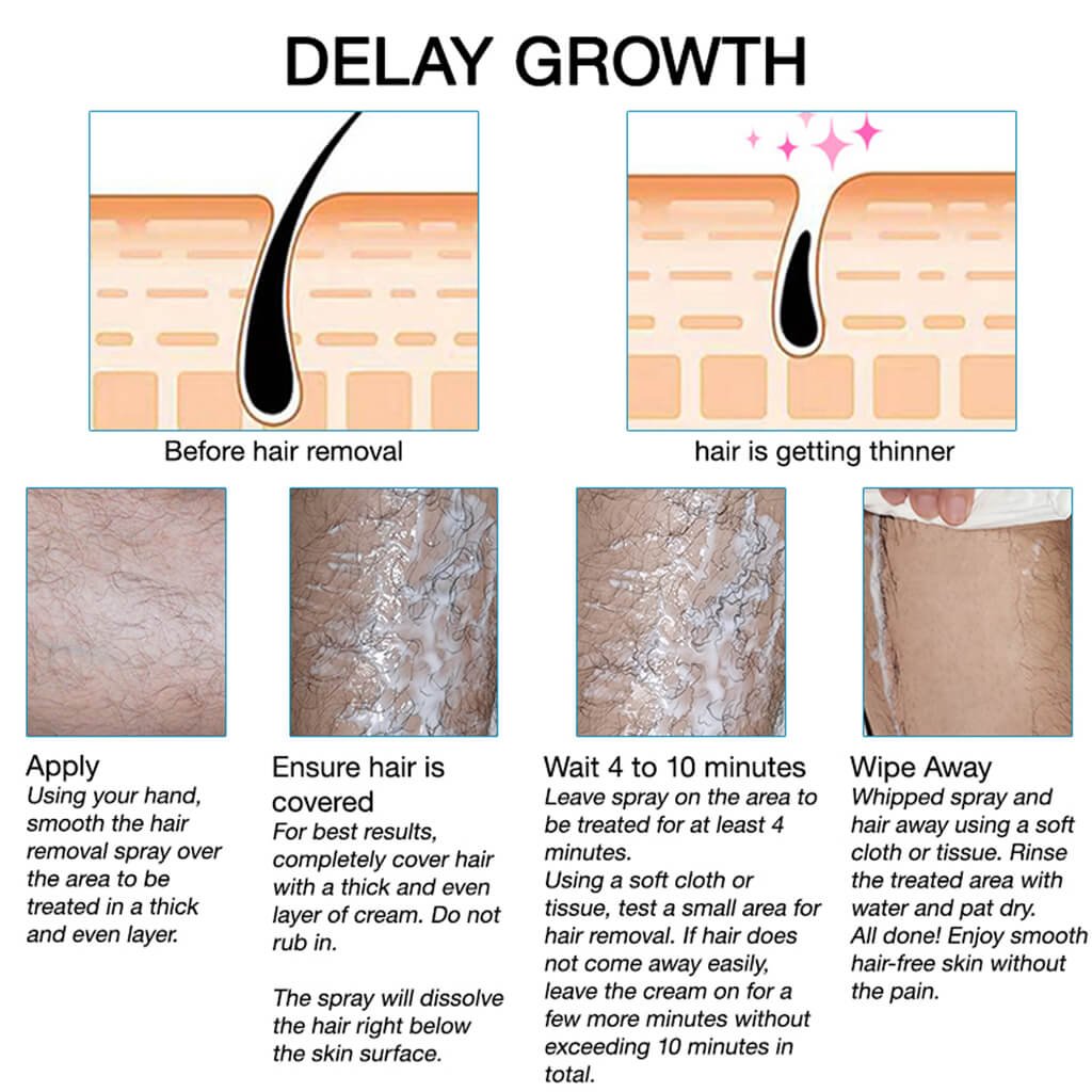 Wait: Leave the spray on for 5–10 minutes. Test a small area with a soft cloth or tissue. If hair does not come off easily, leave it for a few more minutes, maximum 15 minutes.
